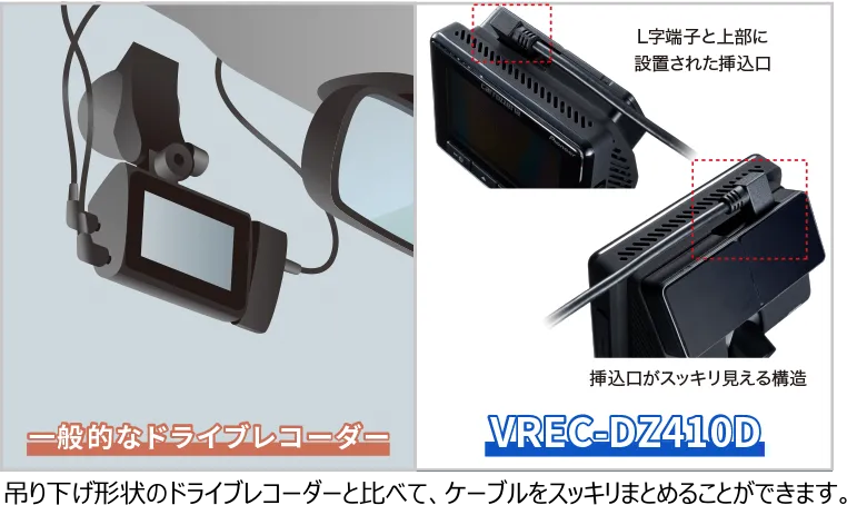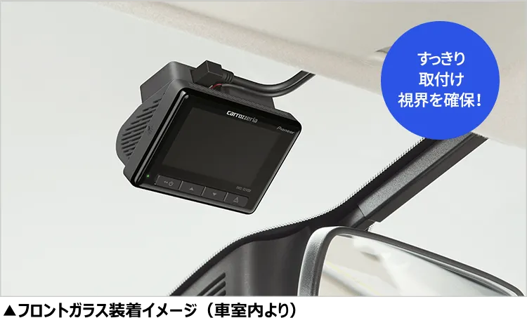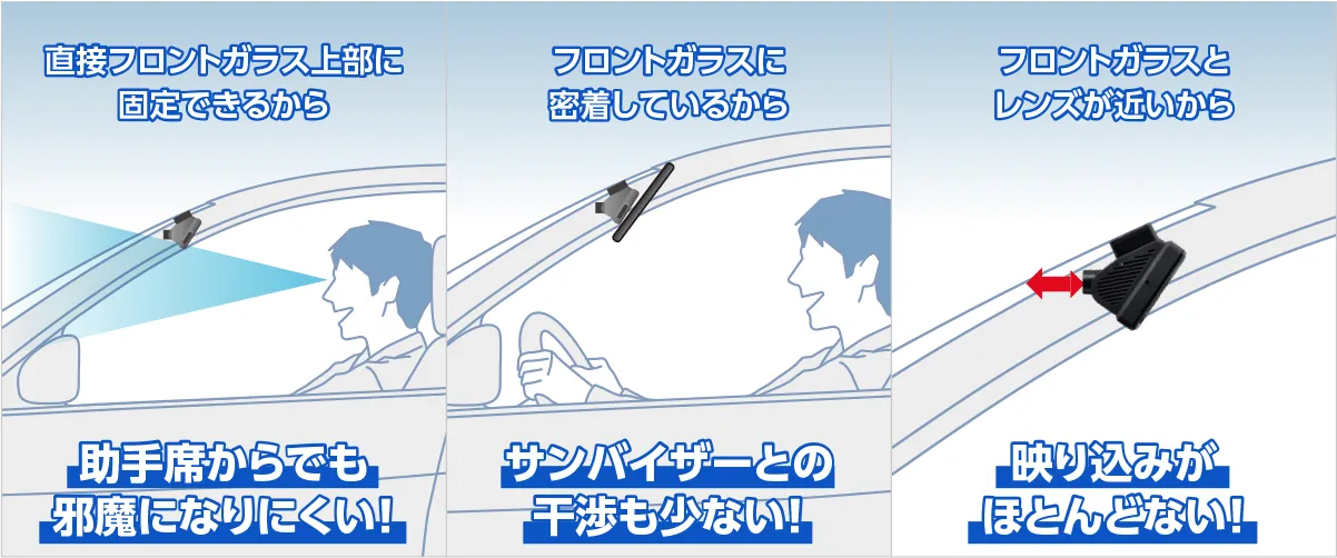 本体を直接フロントガラスにスッキリと取付けられるスマートな形状にすることで、吊り下げ形状に比べて広い視野を確保。フロントガラスとカメラレンズの位置も近いため、映り込みも大幅に軽減されます。