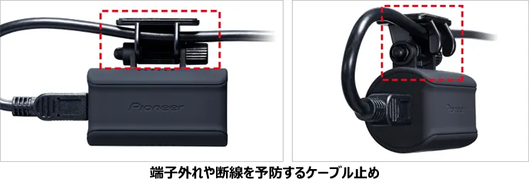 リアカメラは取付時の作業性も考慮し、リアカメラ側の端子にはストレート形状を採用。また、車種により配線の取り回し方向が異なることを踏まえて、端子差込口とは逆方向に配線を取り回す場合に便利な、端子外れや断線を予防するケーブル止めを設置しています。これにより見た目にもスッキリとした取付けが可能です。