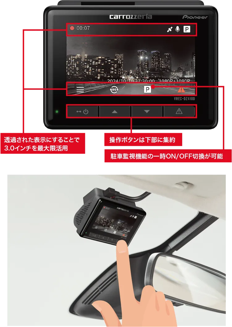 3.0インチの大型液晶を備えながらも、スッキリとした佇まい。落ち着いた表情のラバー調塗装が、黒光沢リングのアクセントを用いたレンズと相まって上質な仕上がりとなっています。また、操作ボタンを下部に設置し、傾斜をつけることで操作性を向上させるなど、カロッツェリアならではのこだわりが隅々にまでつまっています。
