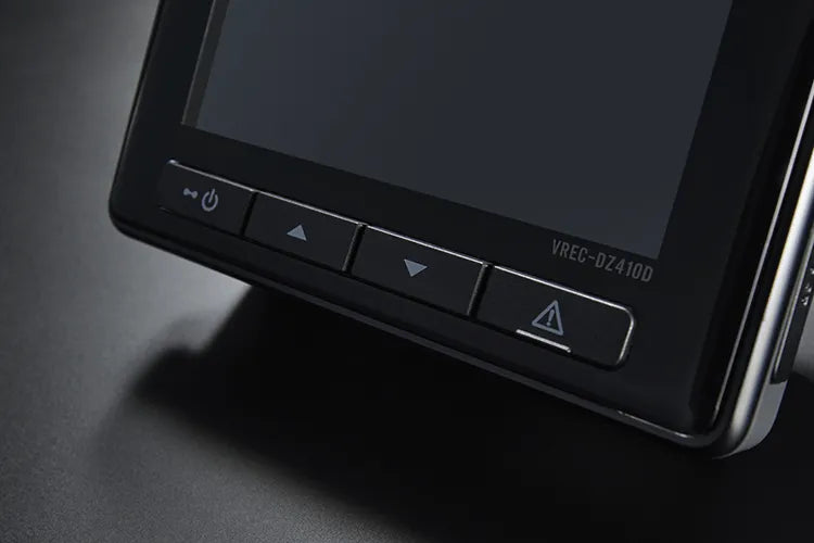 大型液晶により操作画面が見やすく、記録した映像を車内で確認することも可能です。また、操作ボタンはガイド表示と連動した直感的な操作を可能にするとともに、液晶の下部に設置されているため、ミラー裏に取付けた場合でも操作しやすいデザインを実現しています。