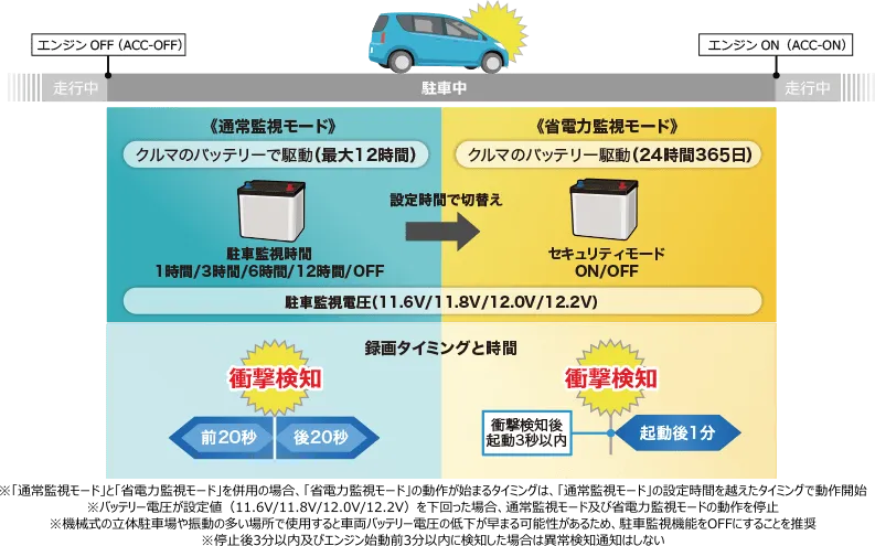 常にバッテリー電圧を監視しており、設定電圧以下になると駐車監視機能が自動的に停止。バッテリーの負担を軽減します。