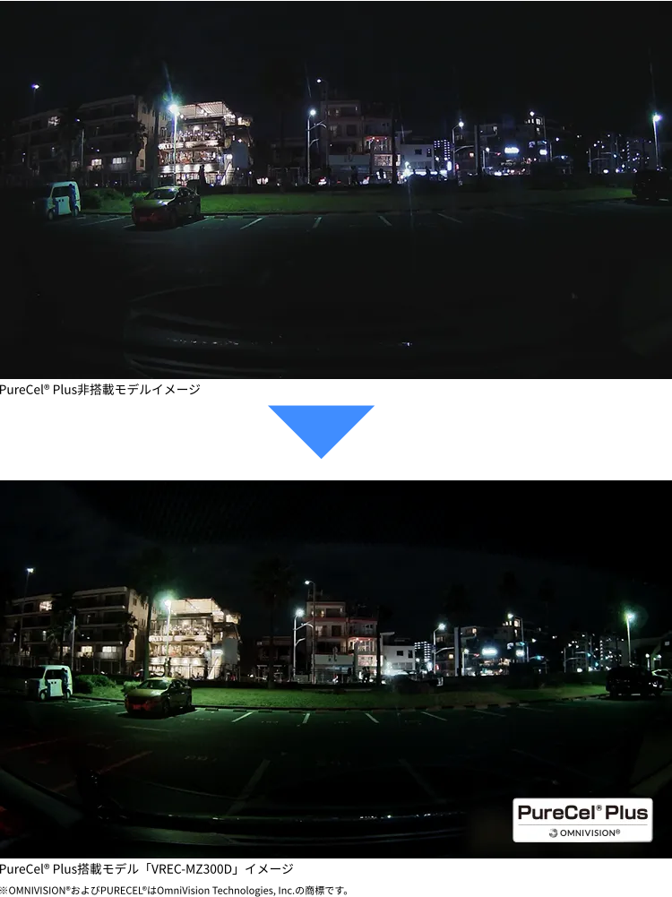 夜間など暗いシーンでの撮影に適した「ナイトサイト」に対応。色混ざりのない鮮やかな色彩表現ができる「 PureCel®Plus 」をフロント/リアカメラに搭載しているため、夜間の走行風景や暗闇の駐車場でも明るく鮮明な映像を記録できます。また、ナンバープレートの文字もくっきり撮れるほどの高画質録画も両立しています。