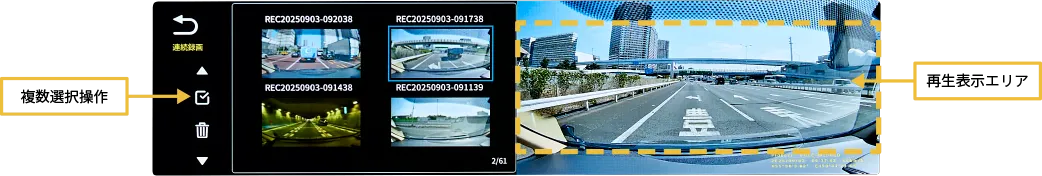 走行中の表示映像はもちろん、ドライブレコーダーで記録した映像も大画面で確認することが可能。確認したい映像は「サムネイル表示」から簡単に探し出すことができます。