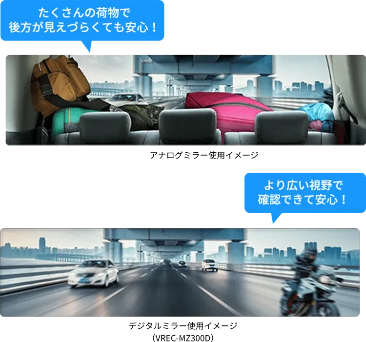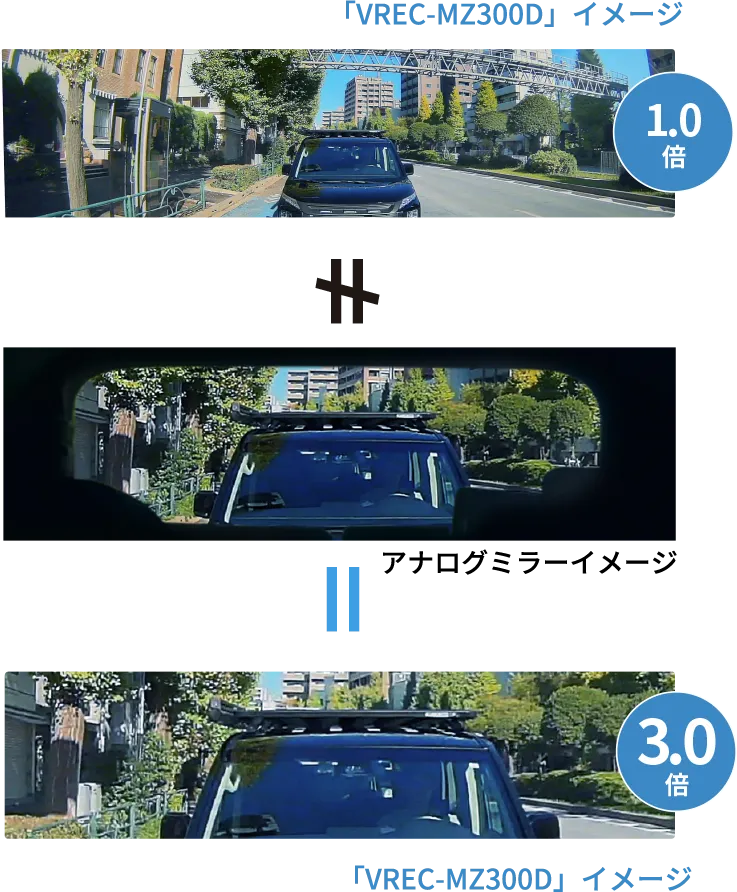 一般的にデジタルミラーは後方を幅広く表示するため、アナログミラーと比較すると後続車両が小さく見えます。そのため後続車両との距離感をつかみやすくするためには2.5倍~3倍のズームが必要になります。この問題を解決するために「VREC-MZ300D」は最大3倍までのズームに対応しているので、アナログミラーのような距離感を感じられる後方画像を映し出します。
