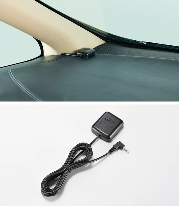 時刻や速度、自車位置を把握するためのGPSアンテナを同梱。ダッシュボードに設置してもドライブ中の視界を邪魔しない小型サイズです。