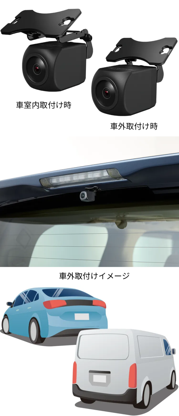 コンパクトサイズのリアカメラは、車室内だけでなく車外にも取付け可能な防水・防塵に対応(IP67相当)。リアガラスの角度がないセダンやスポーツカー、スモークガラスのクルマ、リアガラスを塞いでいる商用車など、より多くのクルマへの取付けを可能にします。