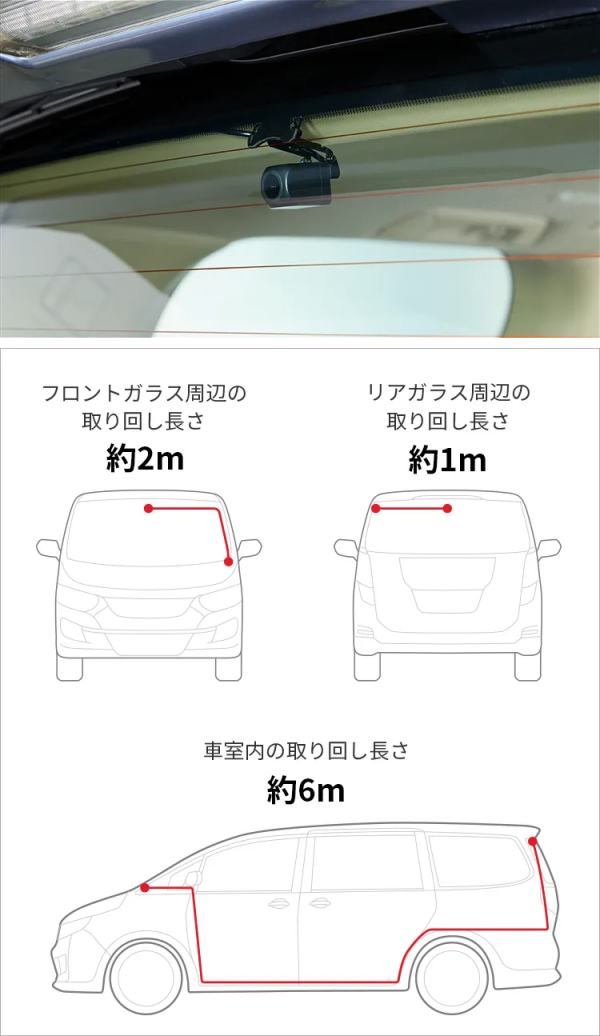大型のミニバンなどにも取付け可能な同梱ケーブル